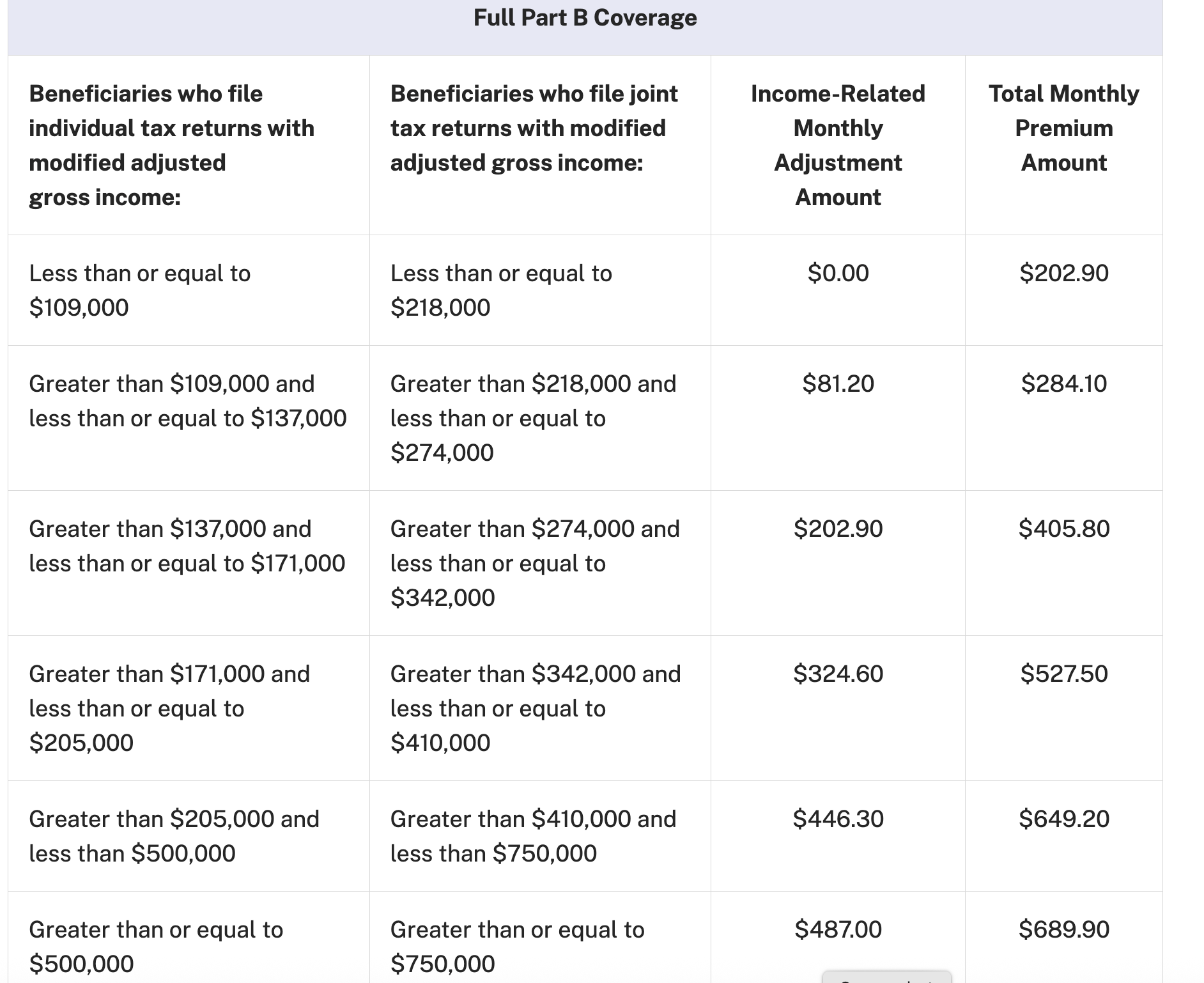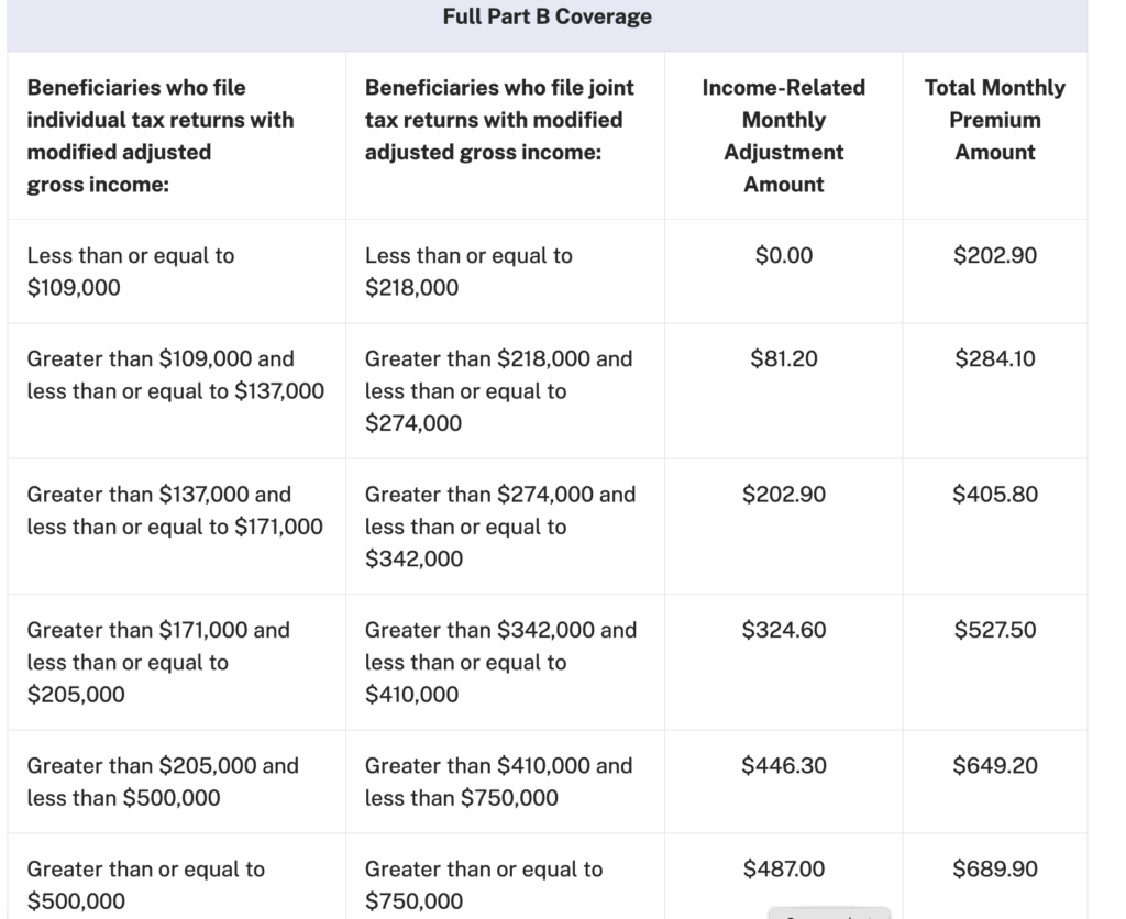 This chart shows the Medicare Part B premiums for higher income beneficiaries: